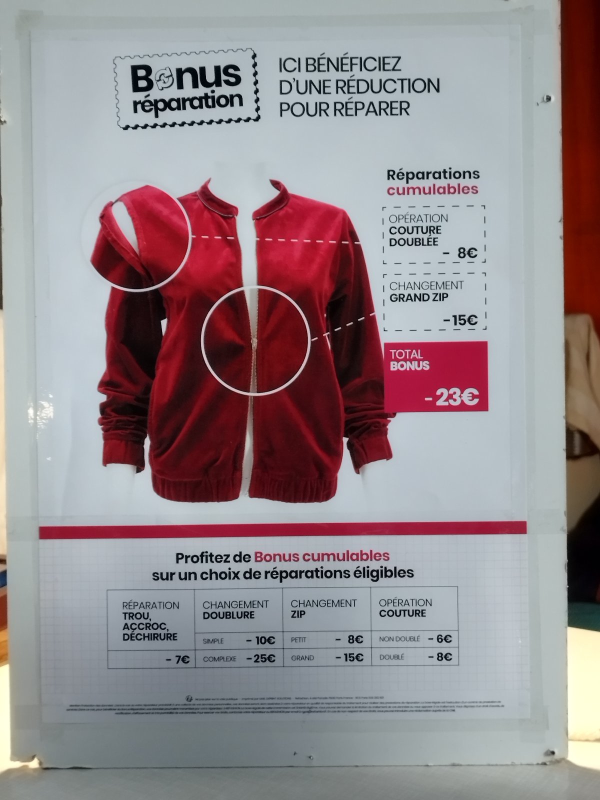 Vous pourrez donc réparer vos vêtements avec une prise en charge financières immédiates pour empêcher des vêtements en bonnes états qui ont juste une bricole de finir a la poubelle et d’être jettes pour un couture qui lâche , un trou au genoux une doublure qui s’effilochent ,,,,